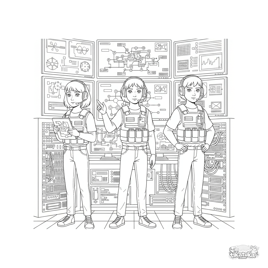 Página para colorir complexa para 10-12 anos: uma equipe de segurança cibernética em um centro de comando de porão high-tech. Muitos detalhes: monitores de segurança, racks de servidores, coletes táticos.