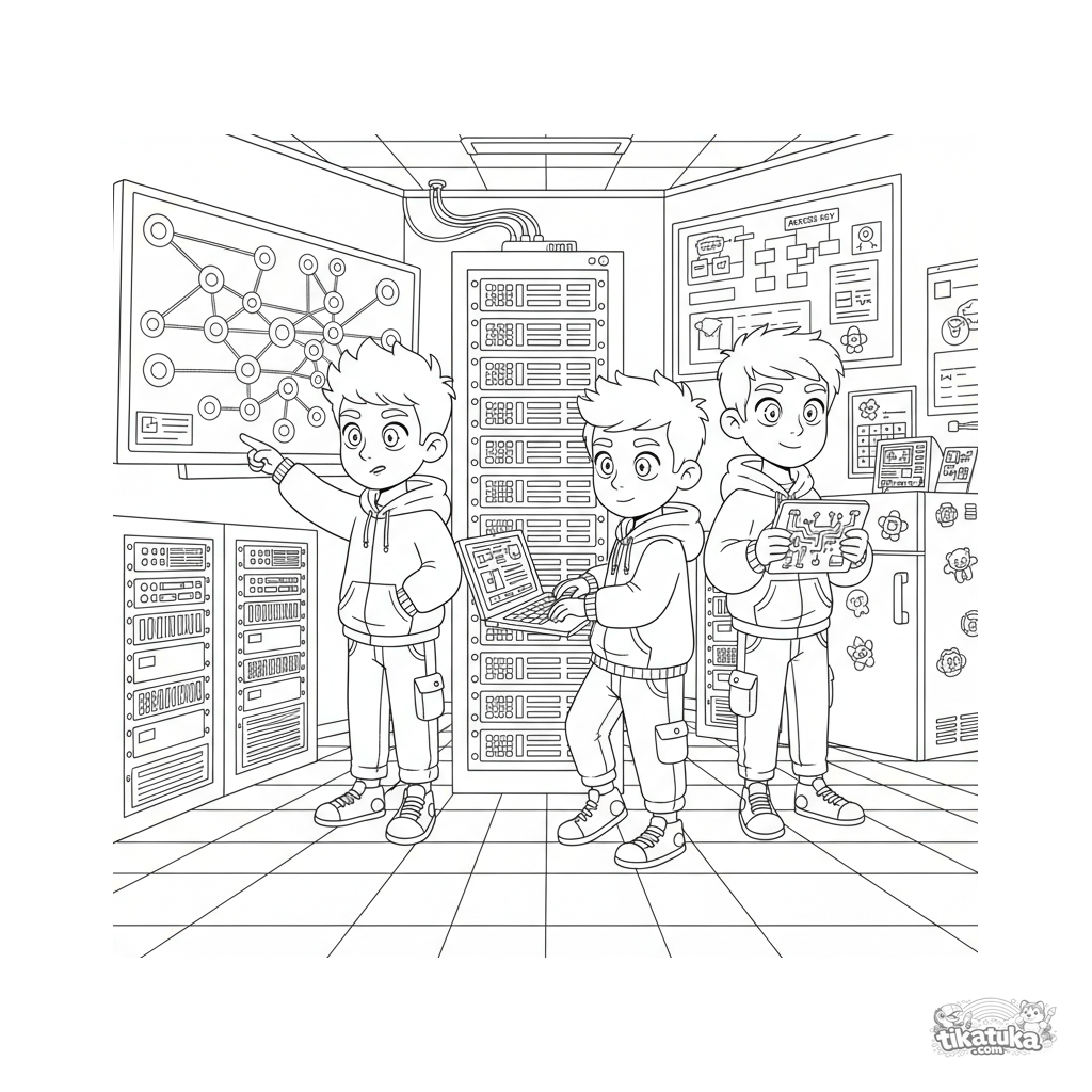 Página para colorir com uma equipe de adolescentes fazendo segurança cibernética em um QG no porão. Muitos detalhes: servidores, telas.