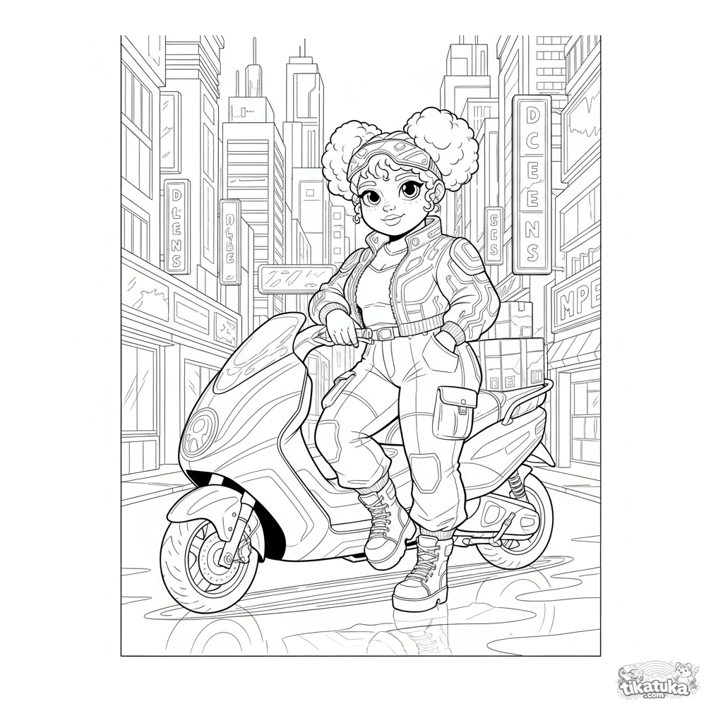 Página para colorir estilo graphic novel para 10-12 anos: uma entregadora cyberpunk em uma cidade de néon. Cena altamente detalhada com scooter flutuante e hologramas.