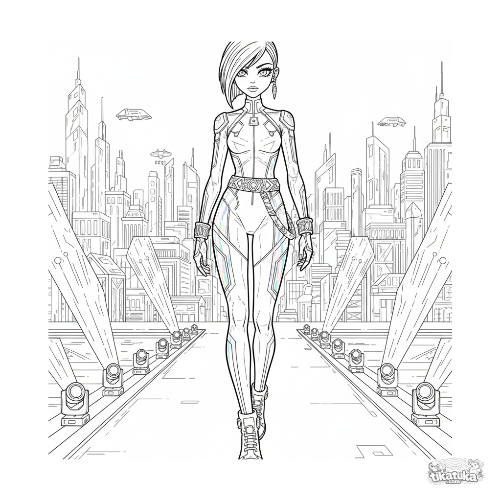Página complexa estilo mangá para colorir: uma modelo de macacão holográfico anda em uma passarela de néon. Cena dinâmica com luzes geométricas e fundo futurista para meninas 10-12.