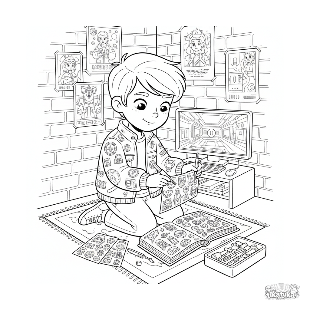 Página para colorir: um adolescente colecionador de adesivos em um porão hacker aconchegante. Muitos detalhes: pôsteres, monitor, ferramentas.