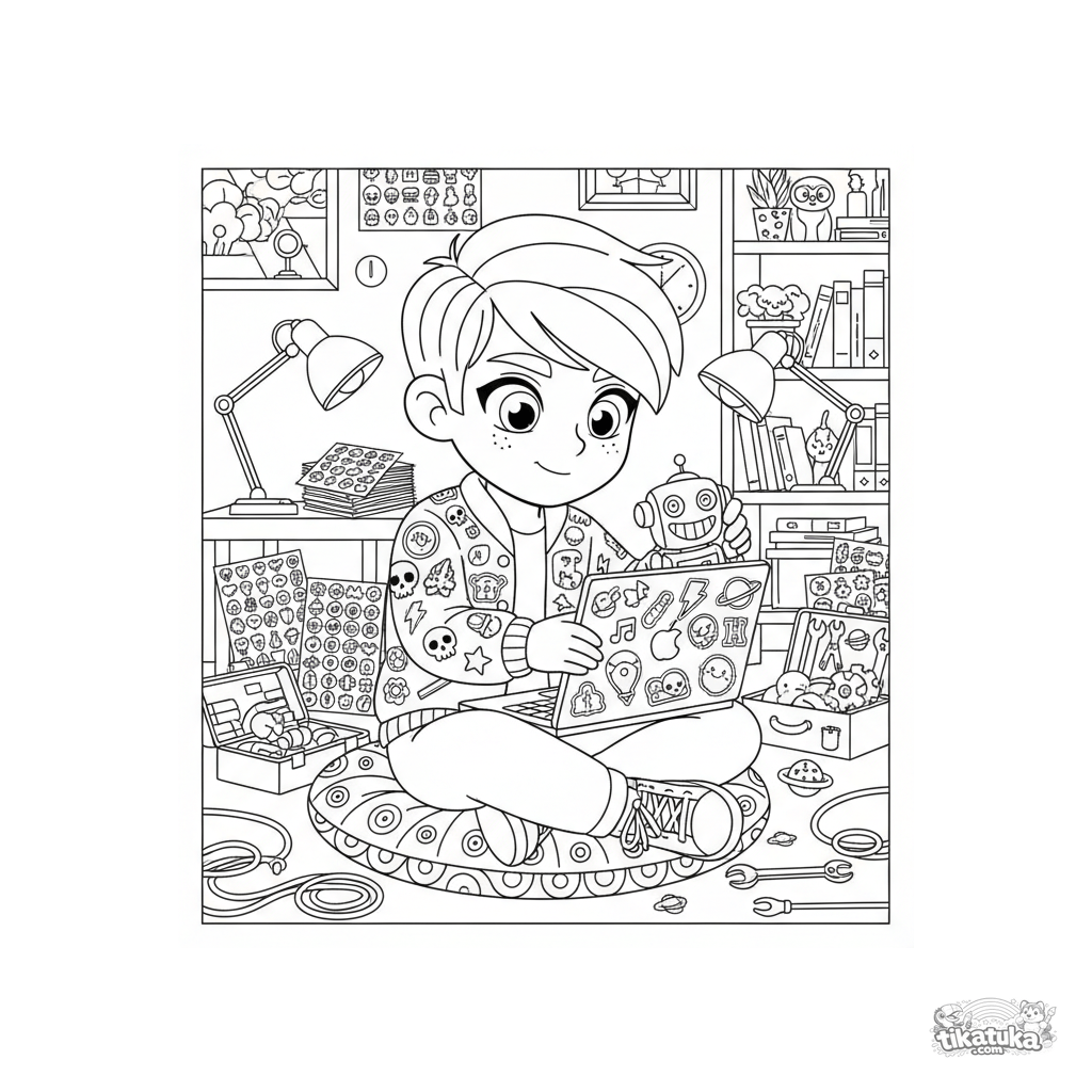 Página para colorir: um adolescente colecionador de adesivos em um porão iluminado por néon. Muitos detalhes: jaqueta com patches, laptop com adesivos, ferramentas.