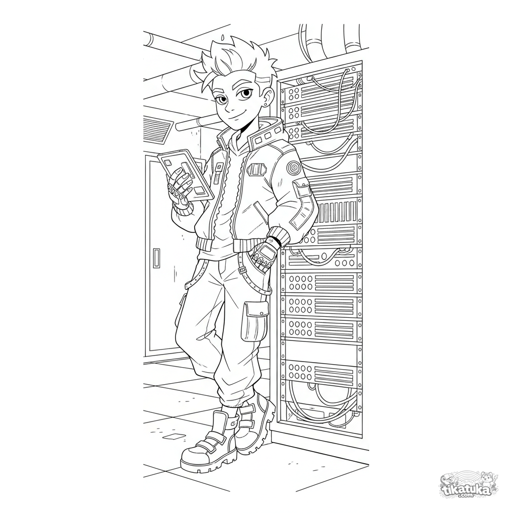 Página para colorir para crianças de 10-12 anos: um hacker em traje cyberpunk de pé confiantemente ao lado de um rack de servidores brilhante no porão. Cena detalhada com estilo e tecnologia.