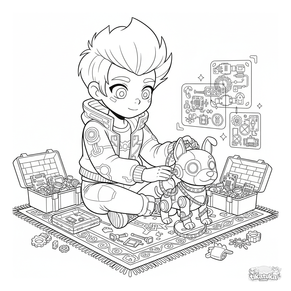 Página para colorir para crianças de 10-12 anos: um adolescente no estilo cyberpunk personalizando um robô de estimação em um espaço de porão com ferramentas e telas holográficas.