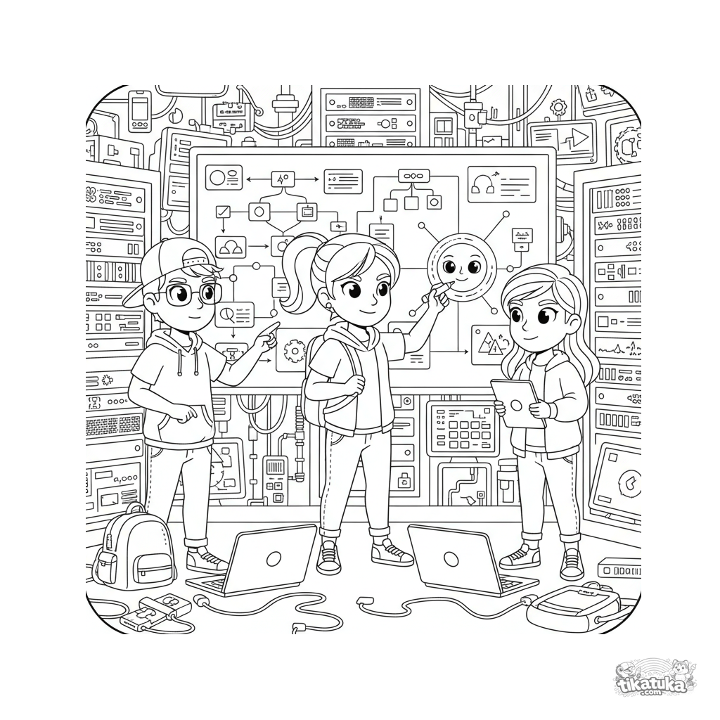 Página para colorir para crianças de 10-12 anos: uma equipe de segurança cibernética planeja um projeto em um quadro branco em um porão. Detalhes: diagramas de rede, mochilas, laptops, discussão dinâmica.