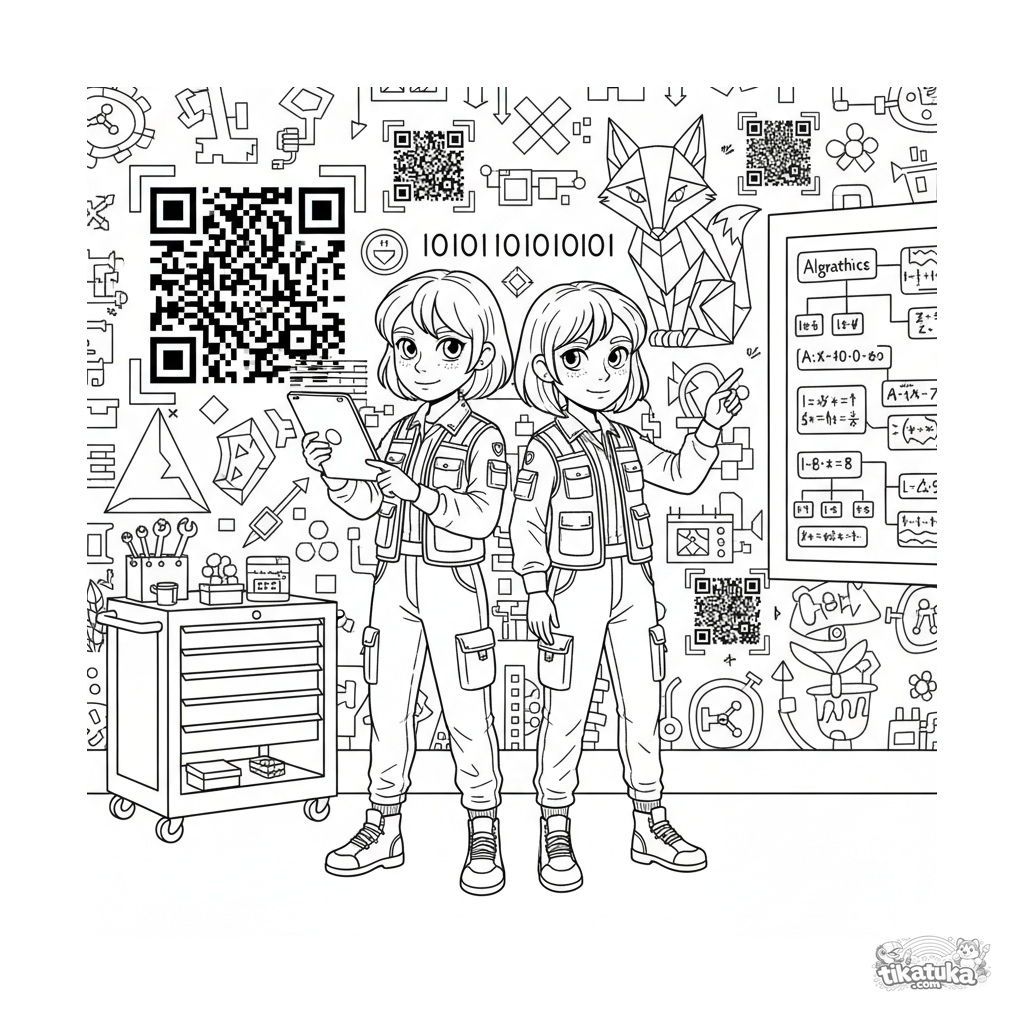 Página para colorir para crianças 10-12: uma dupla de hackers no porão decifrando uma mensagem secreta em uma parede com graffiti. Cena detalhada com códigos QR, tablet e quadro branco.