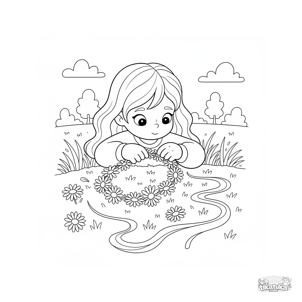 Página para colorir para crianças de 4-6 anos: mãos trançando uma grinalda de margaridas em um prado. Cena doce e calma.