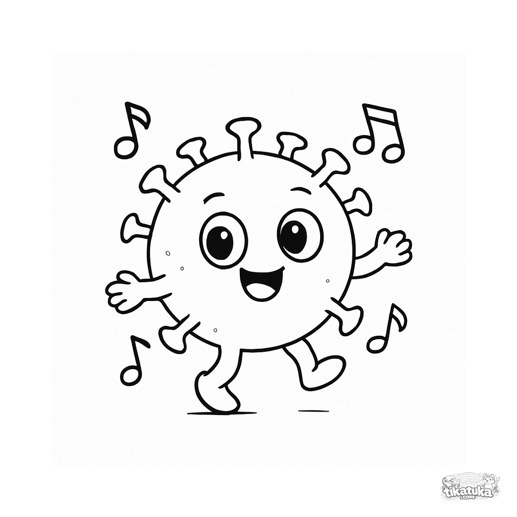 Página para colorir para crianças. Um vírus esférico fofo com espinhos roxos dançando feliz com notas musicais flutuantes. Download grátis.