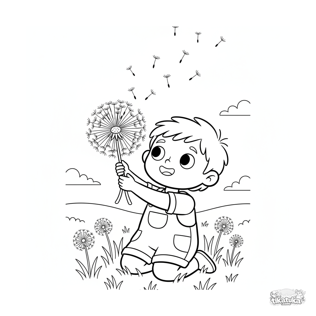 Página para colorir para crianças 4-6: uma criança em um campo fazendo um desejo soprando sementes de dente-de-leão. Cena calorosa.