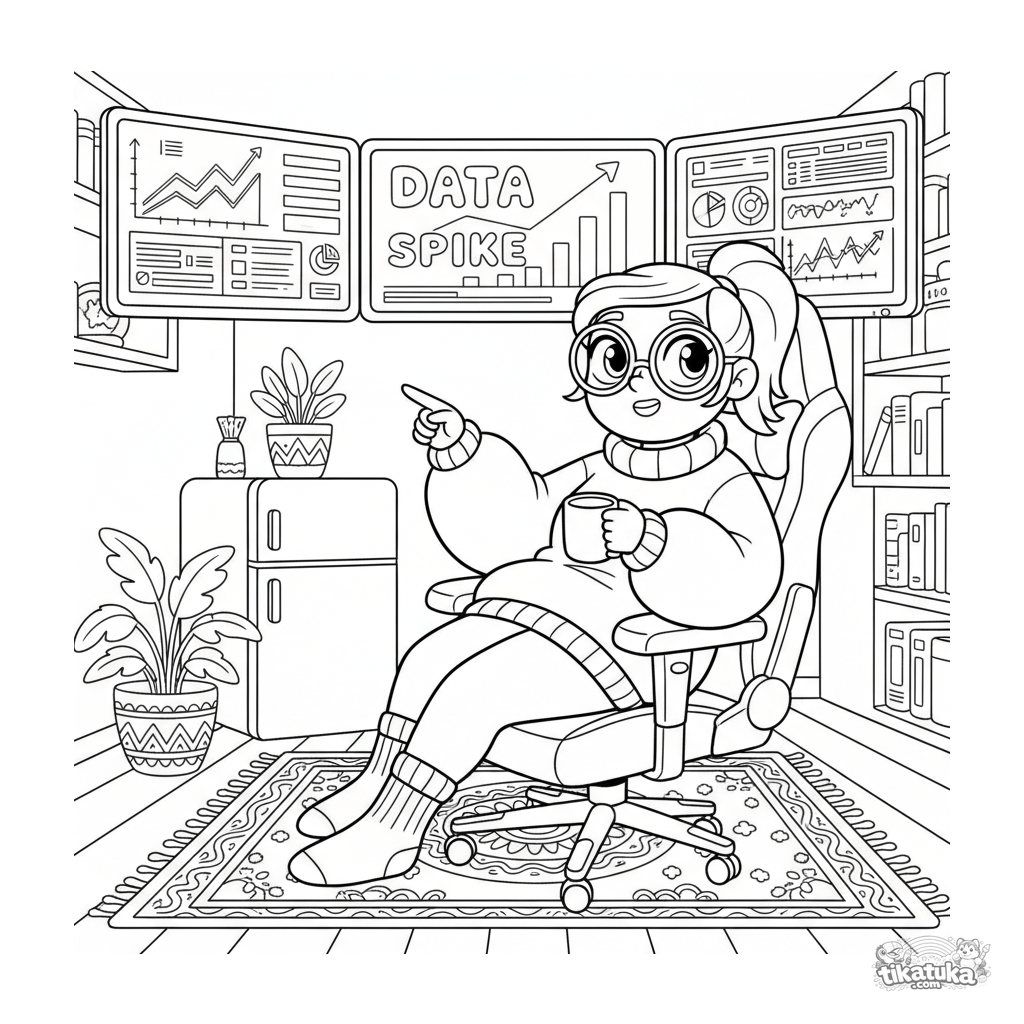 Página para colorir para crianças mais velhas: um analista de dados trabalha com gráficos em vários monitores em seu cantinho aconchegante do porão. Cena com alto detalhe.