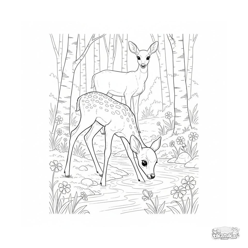 Página detalhada para colorir em estilo aquarela para crianças 10-12: um filhote de veado cauteloso bebe de um riacho na floresta, observado por sua mãe.