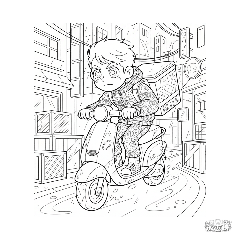 Página para colorir estilo manga-ação energética para 10-12 anos: um entregador em um scooter flutuante corre por um beco noturno com néon, desviando de caixas e placas luminosas com uma caixa térmica.