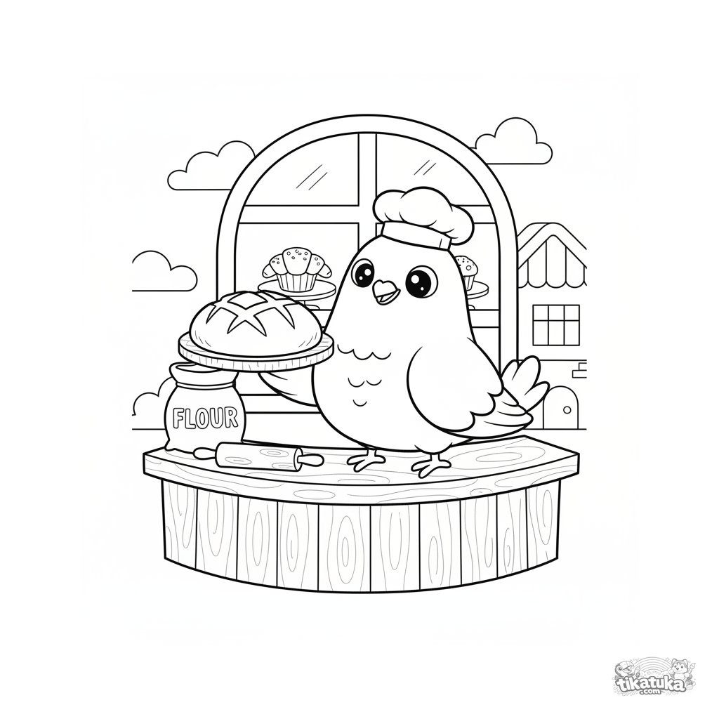Página para colorir para crianças: um pombo padeiro aconchegante exibe pão fresco numa padaria. Formas de boneco macias, margens amplas, para 4-8 anos.
