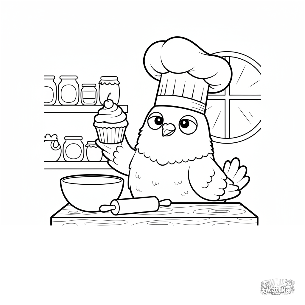 Página para colorir de um pombo padeiro segurando um bolinho. Para crianças de 4 a 6 anos. Pássaro fofo com chapéu de chef atrás do balcão.