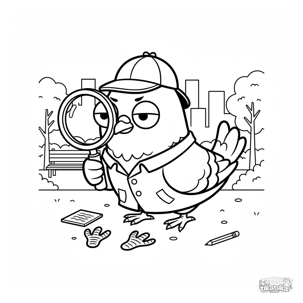 Página para colorir de um pombo detetive examinando uma pegada com lupa no parque. Para crianças de 4 a 6 anos. Pássaro engraçado em trench coat e chapéu.