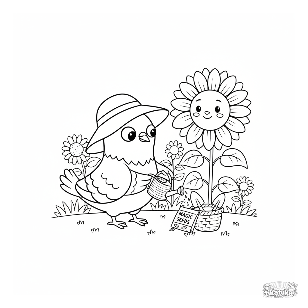 Página para colorir para crianças: um pombo jardineiro com chapéu rega um grande girassol sorridente. Formas suaves de flores, margens amplas, para 4-8 anos.