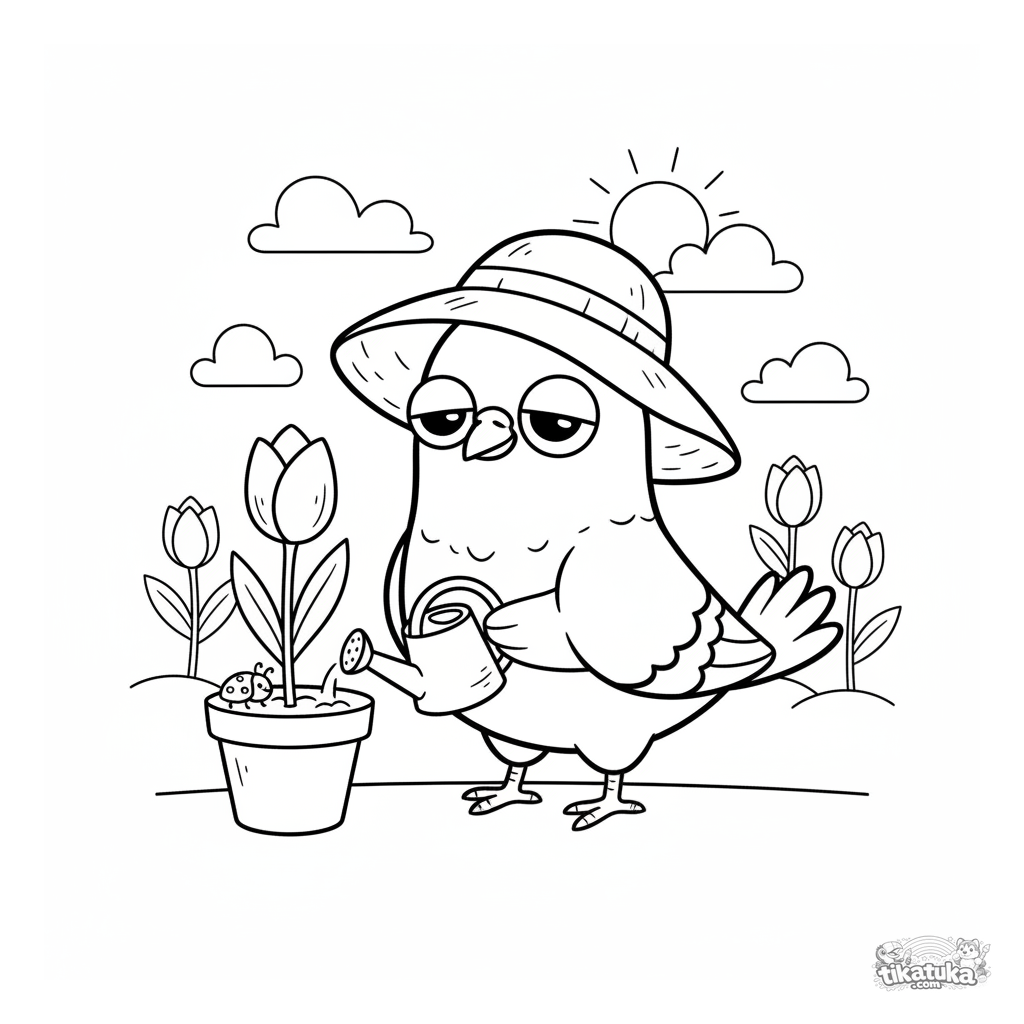 Página para colorir para crianças 4-6: um jardineiro pombo rega uma tulipa. Cena tranquila, regador simples, joaninha, margens amplas.
