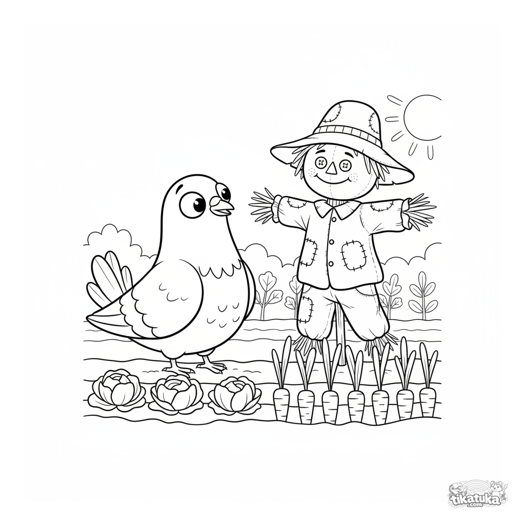 Página para colorir de um pombo bobo curioso inspecionando um espantalho de jardim. Para crianças de 4 a 6 anos.