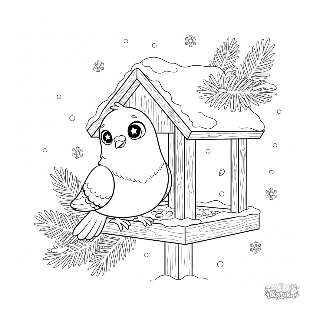 Página para colorir de inverno com um pombo inspecionando um alimentador de pássaros nevado. Cena aconchegante com neve caindo para crianças em idade pré-escolar.