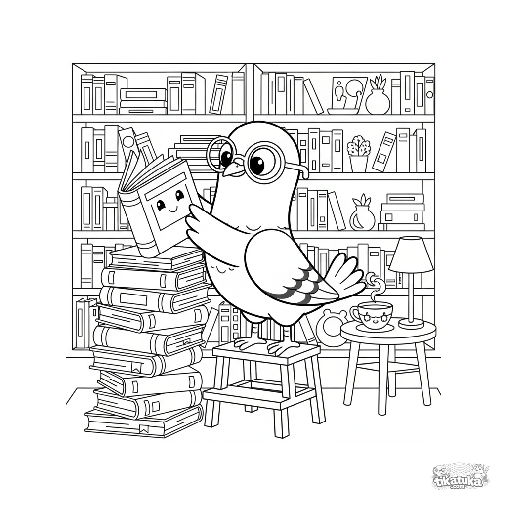 Página para colorir para crianças: um pombo bibliotecário com óculos coloca cuidadosamente um livro numa pilha. Atmosfera aconchegante de biblioteca, margens amplas, para 4-8 anos.
