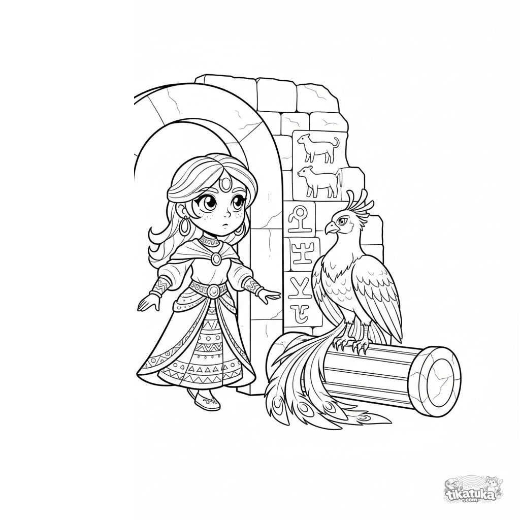 Página para colorir detalhada para crianças mais velhas de 10-12 anos: uma princesa do deserto com braceletes dourados explora ruínas de pedra antigas, acompanhada por uma majestosa fênix empoleirada em uma coluna.