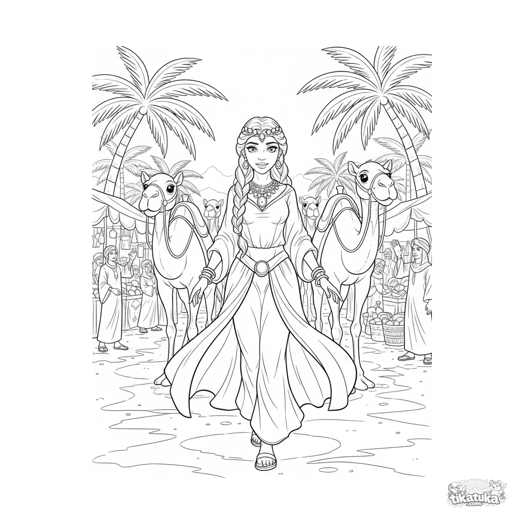 Página para colorir para crianças 7-9: uma princesa do deserto com joias de ouro lidera camelos por um movimentado mercado de oásis. Cena de celebração e mercado.