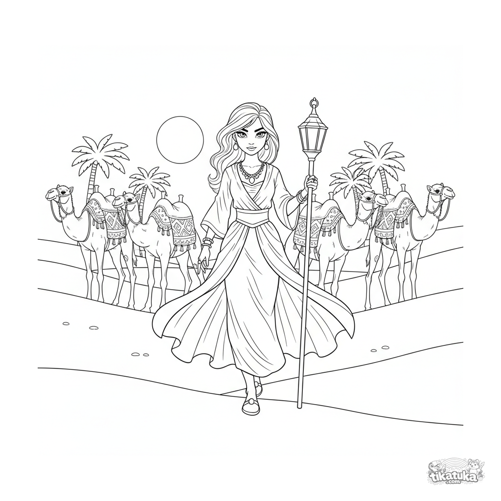 Página para colorir para crianças 7-9: uma princesa do deserto lidera uma caravana de camelos por dunas ao amanhecer em direção a um oásis.