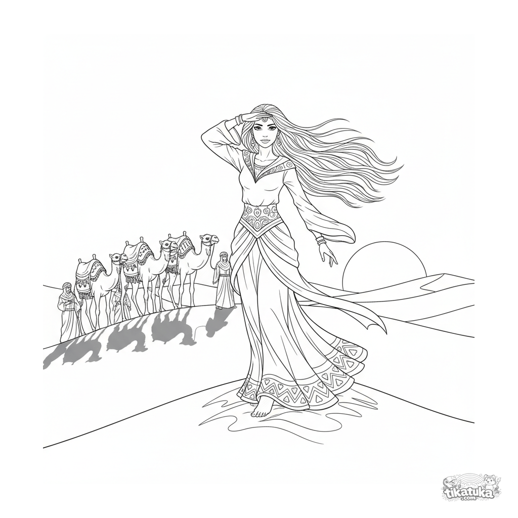Página para colorir detalhada para crianças 10-12: uma princesa do deserto lidera uma caravana de camelos ao pôr do sol. Padrões intrincados e cena atmosférica.