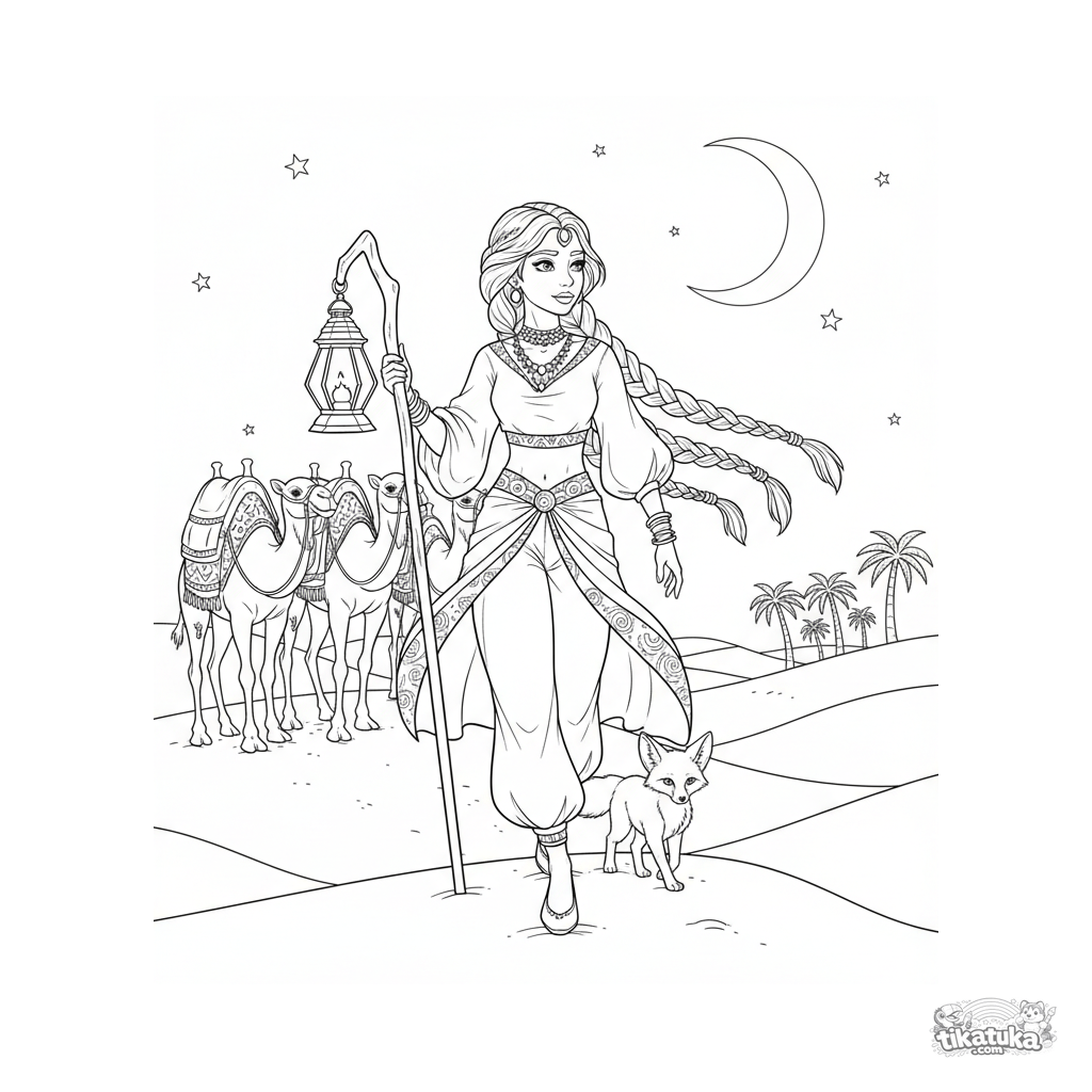 Página para colorir detalhada para crianças de 10-12 anos: uma princesa do deserto em sedas lidera uma caravana de camelos por dunas ao anoitecer, com um cajado de lanterna e uma raposa do deserto.