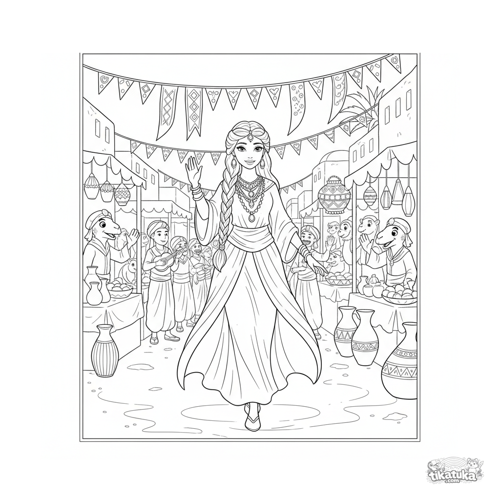 Página para colorir para crianças 7-9: uma princesa do deserto lidera um desfile festivo por um mercado oasis movimentado.