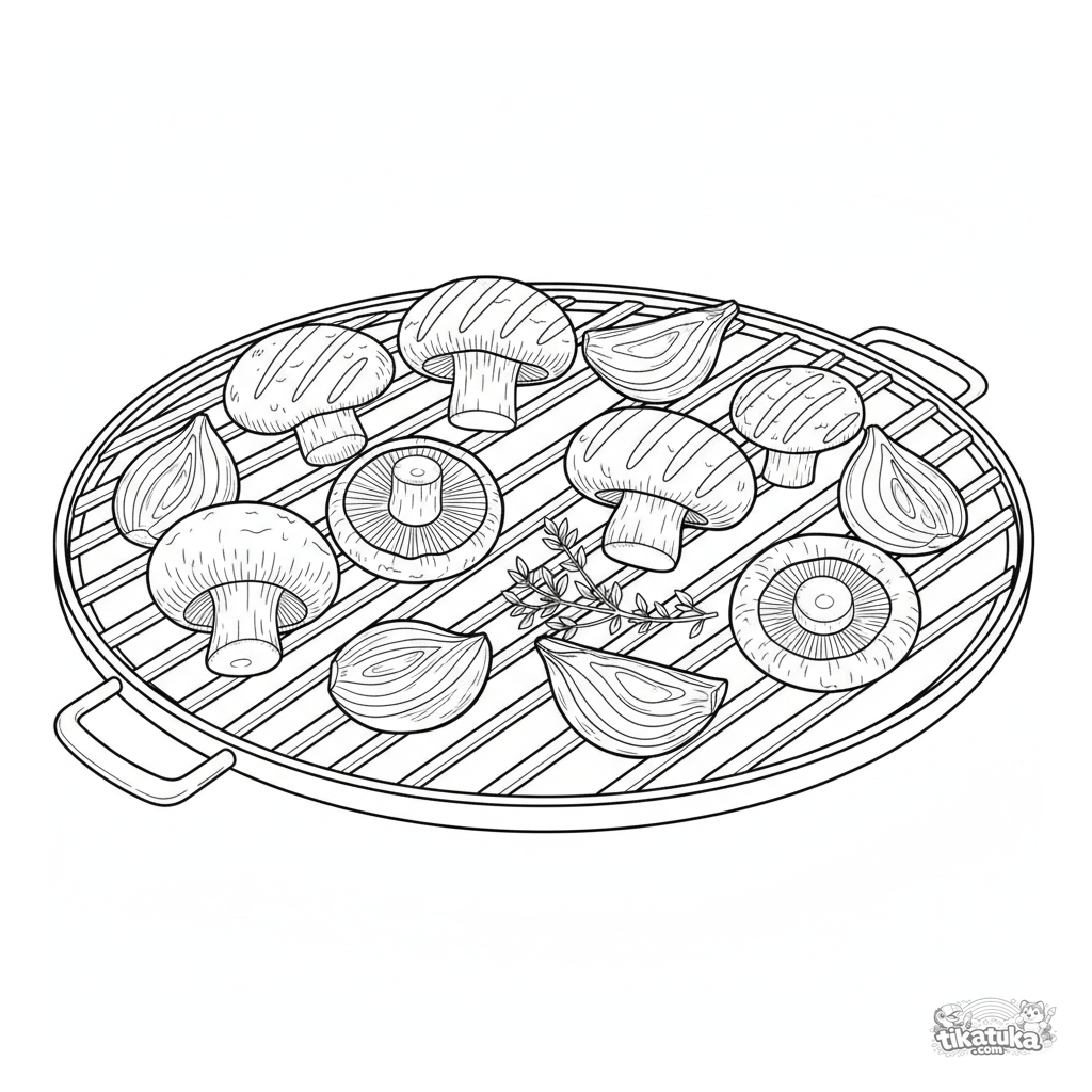 Página para colorir para crianças mais velhas 10-12 anos: um sortimento detalhado de cogumelos e cebola em uma grelha de jardim.