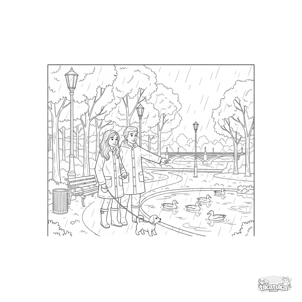 Página para colorir detalhada para crianças mais velhas 10-12: uma cena em um parque outonal durante a chuva. Uma família com capas de chuva passeia com um cachorro, patos em um lago, bancos e lampiões. Muitos elementos para colorir.