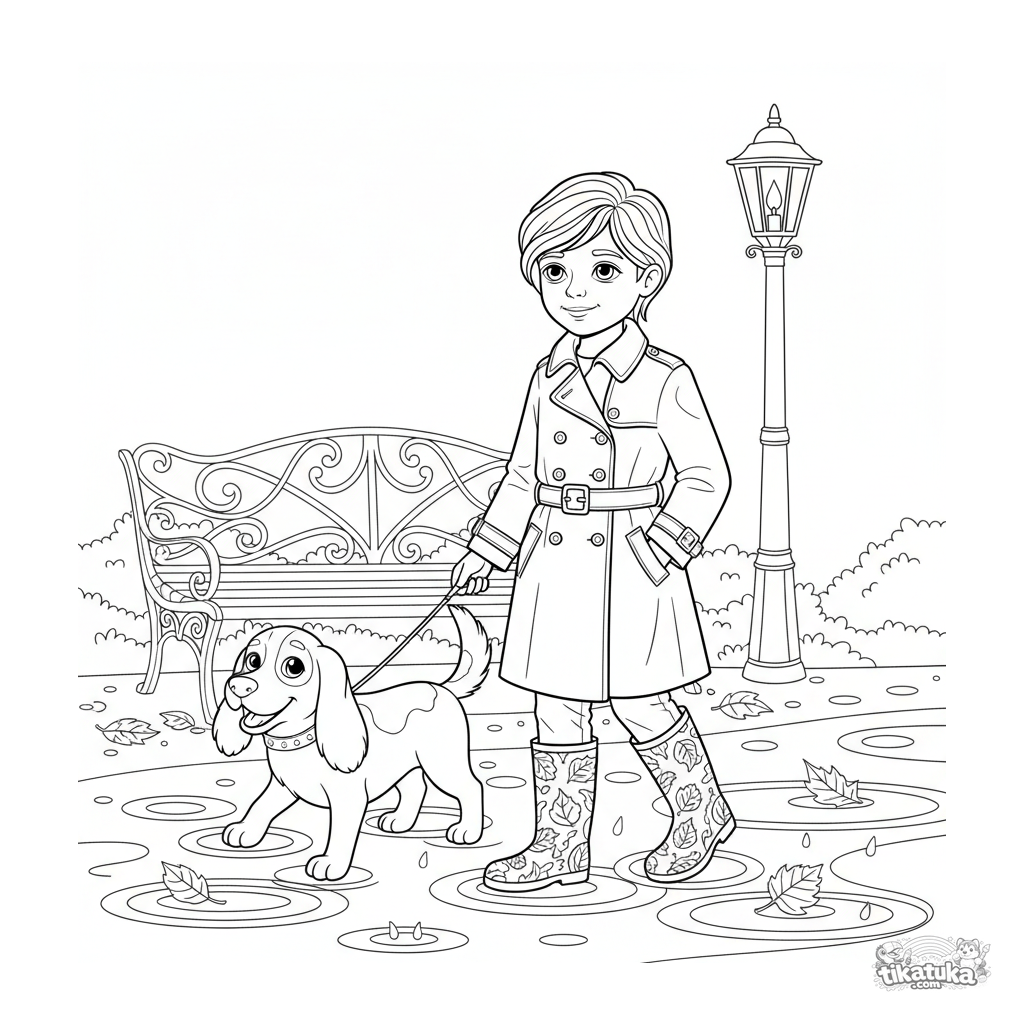 Página para colorir detalhada para crianças de 10-12 anos: uma criança de trench coat passeia com um cachorro na chuva em um parque de outono. Cena complexa com texturas de chuva e folhas.