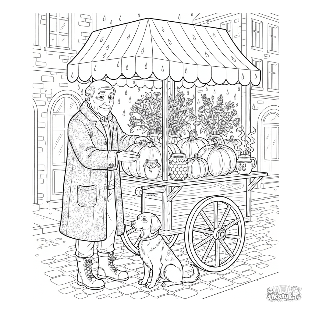 Página para colorir detalhada para crianças 10-12 anos: um vendedor de rua com um carrinho de produtos sob uma marquise em um dia chuvoso de outono. Cena rica em detalhes.