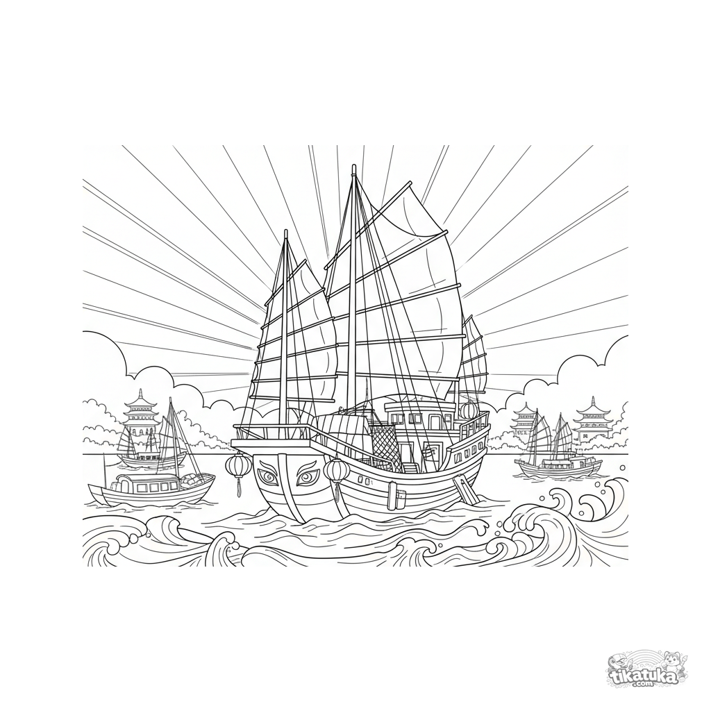 Página para colorir intrincada para crianças mais velhas de 10-12 anos: um junco chinês detalhado com múltiplas velas repousa em um porto ao pôr do sol.