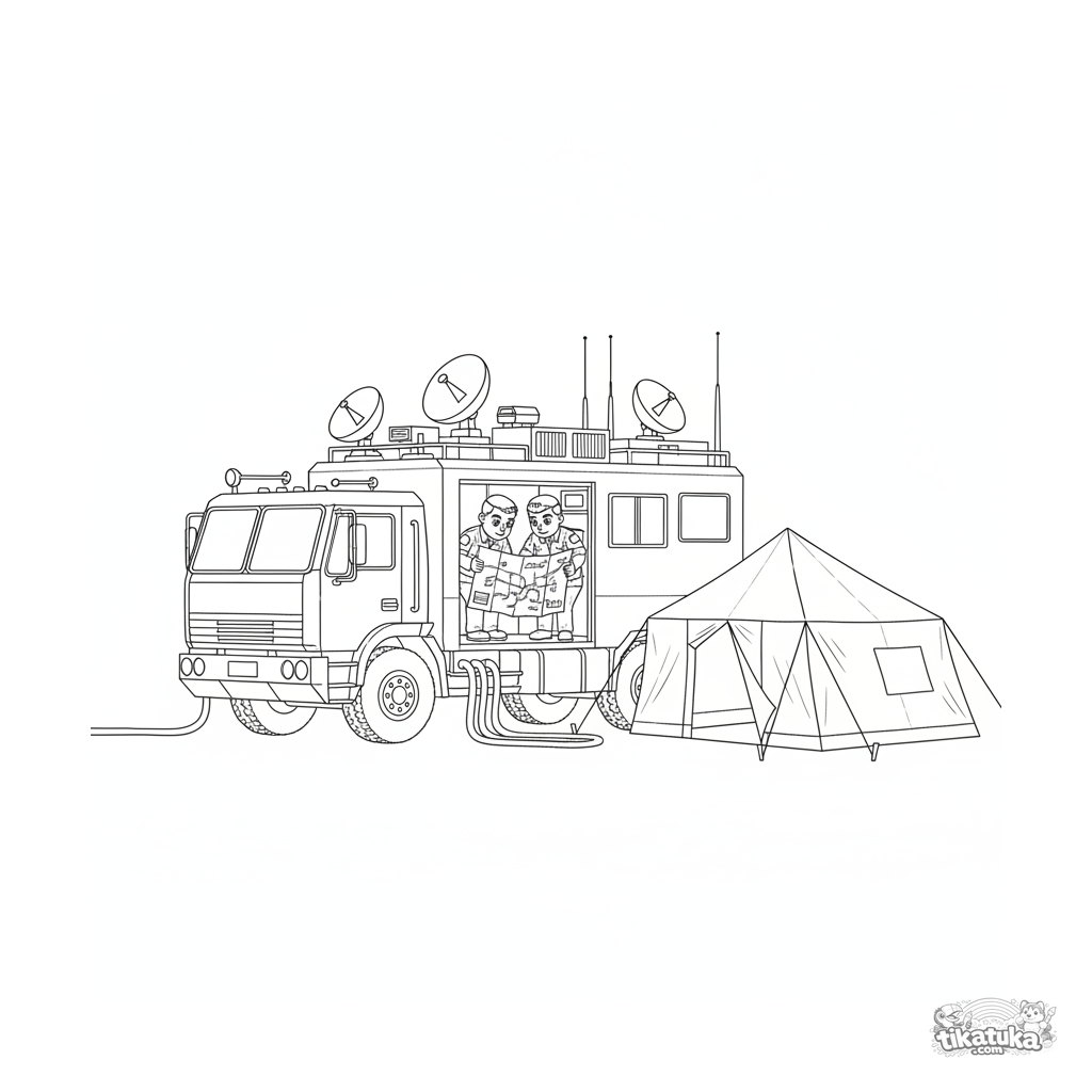 Página para colorir detalhada para crianças maiores 10-12: um caminhão de posto de comando intrincado com muitas antenas em um acampamento de campo.
