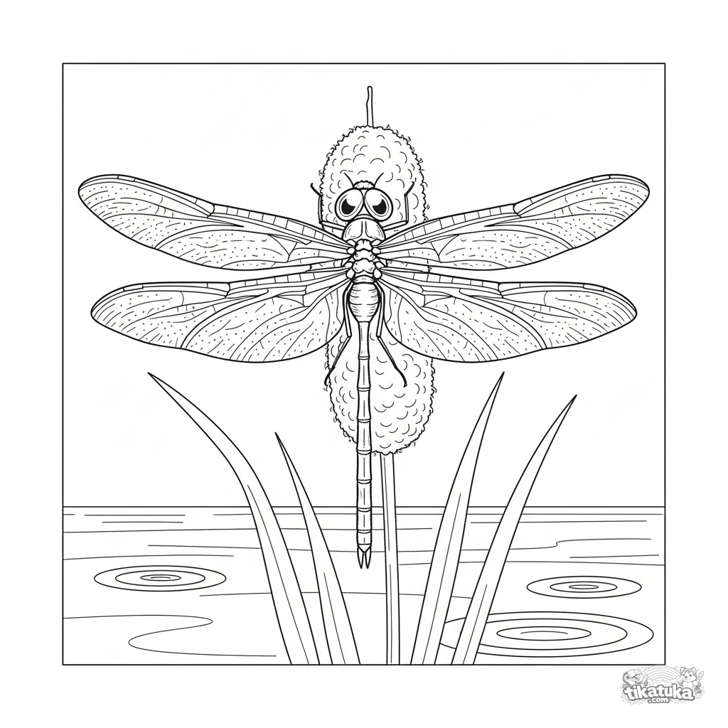 Página complexa para colorir para crianças 10-12 anos: uma libélula detalhada descansando num taboa junto a um riacho. Estilo inspirado em gravuras vintage.