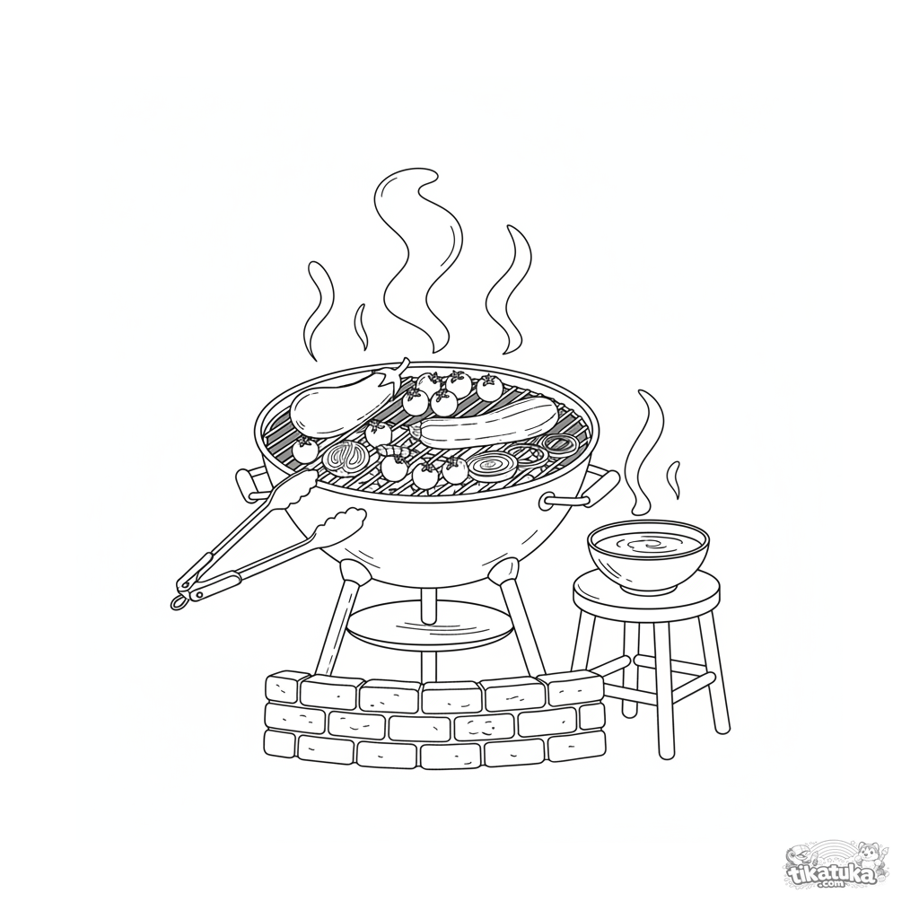 Página para colorir detalhada de uma grelha de jardim com beringela, abobrinha, tomates e cebolas, com utensílios. Para 10-12 anos.