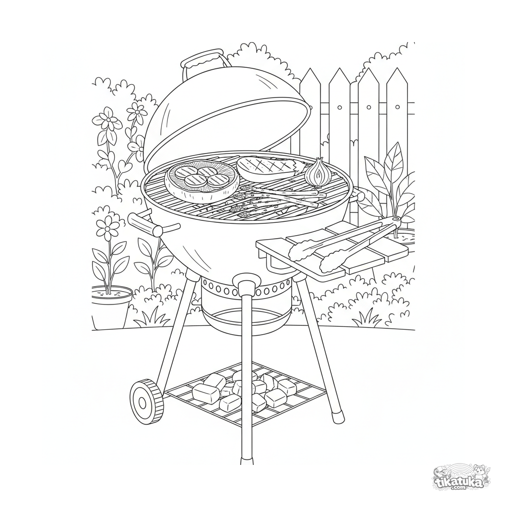 Página detalhada para colorir para crianças de 10-12 anos: uma churrasqueira de jardim cheia de vários legumes. Apresenta cogumelos, berinjela, aspargos, cebola e utensílios.