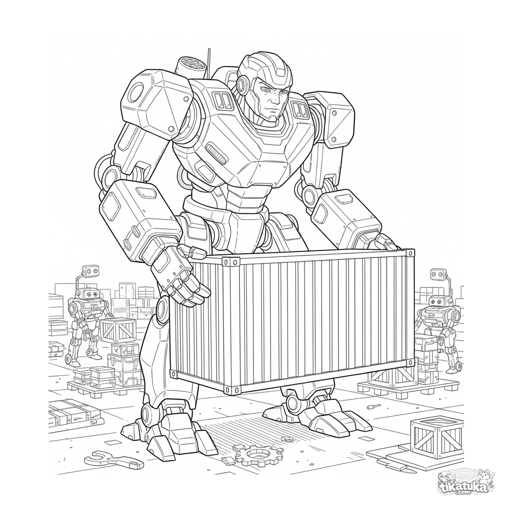 Página para colorir complexa para crianças maiores 10-12: um poderoso mech carregador com braços hidráulicos detalhados descarrega um contêiner em um armazém. Fundo com outros robôs e caixas.