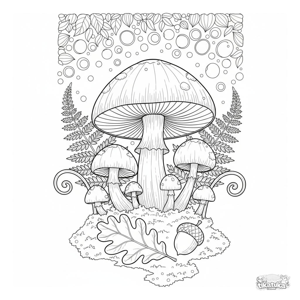 Página para colorir detalhada do chão de uma floresta com cogumelos e samambaias no outono. Para crianças mais velhas de 7 a 12 anos. Apresenta um cogumelo grande, uma bolota e folhas caindo.
