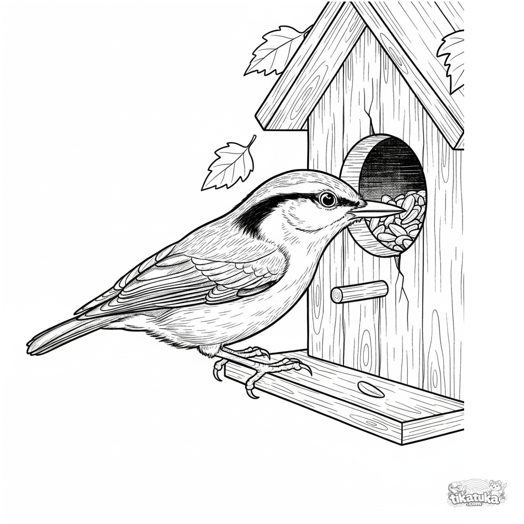 Página para colorir detalhada para crianças mais velhas 10-12: uma trepadeira a armazenar sementes nas fendas de uma casa de pássaros de madeira. Estilo gravura, com textura de madeira e folhas de outono.