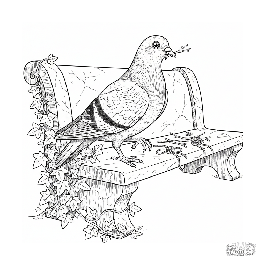 Página para colorir detalhada para 10-12 anos: um pombo realista no encosto de um banco coleta gravetos para um ninho. Estilo de gravura vintage, hera ao fundo.