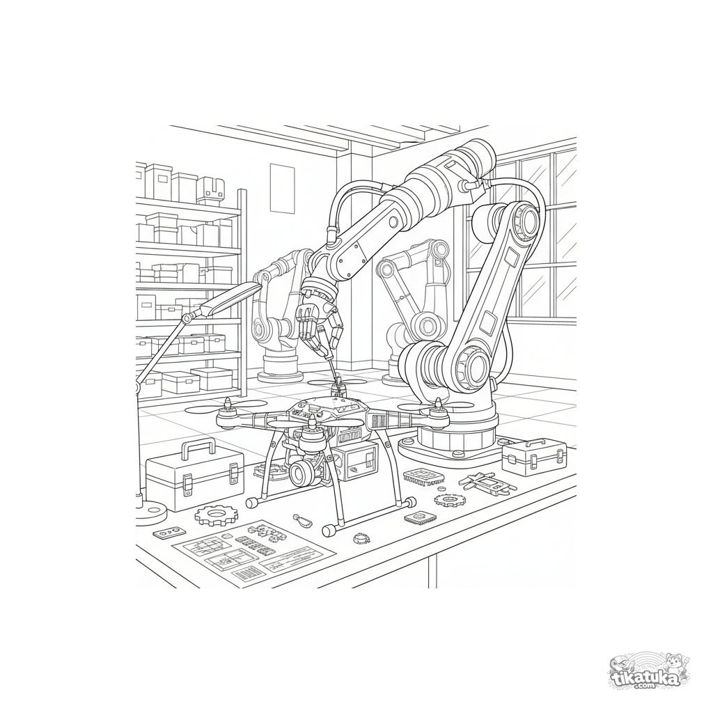 Página para colorir detalhada para crianças mais velhas de 10 a 12 anos: um braço robótico intrincado repara um drone em uma oficina de armazém.