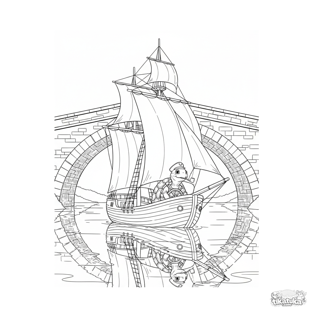 Página para colorir para crianças mais velhas 10-12: um veleiro de madeira detalhado passa sob o arco de uma ponte de pedra sobre um rio largo. Um capitão tartaruga está no leme. Linhas limpas e precisas, atmosfera serena.