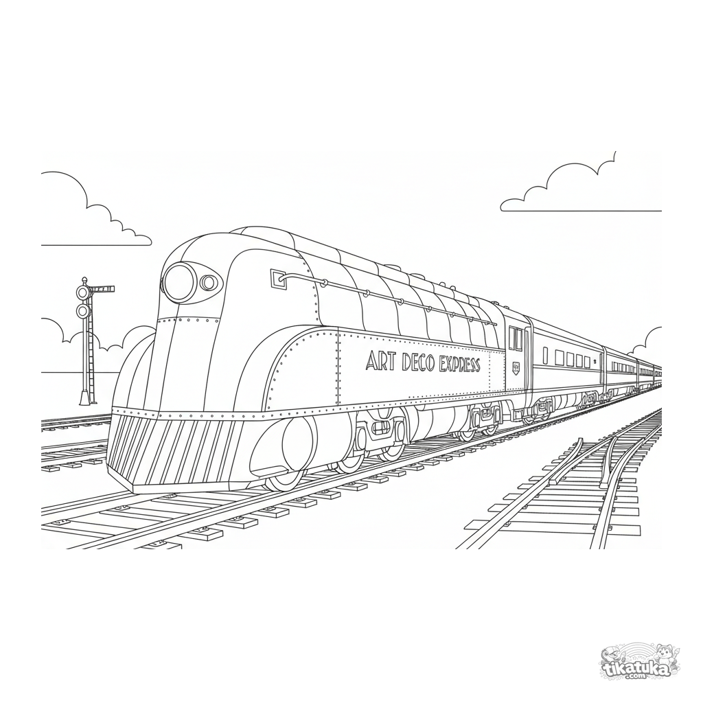 Página para colorir intrincada para crianças de 8 a 12 anos: uma locomotiva streamliner art déco dos anos 1930 detalhada. Ilustração realista para entusiastas de veículos.