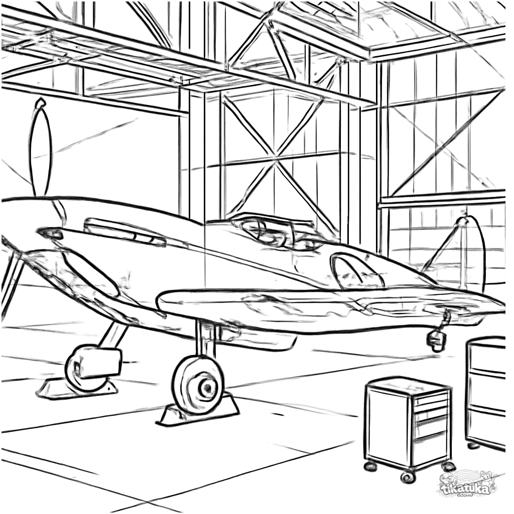 Página para colorir de um avião de caça histórico da 2ª Guerra dentro de um hangar. Para crianças de 8 a 12 anos. Representação realista com equipamentos e iluminação dramática.