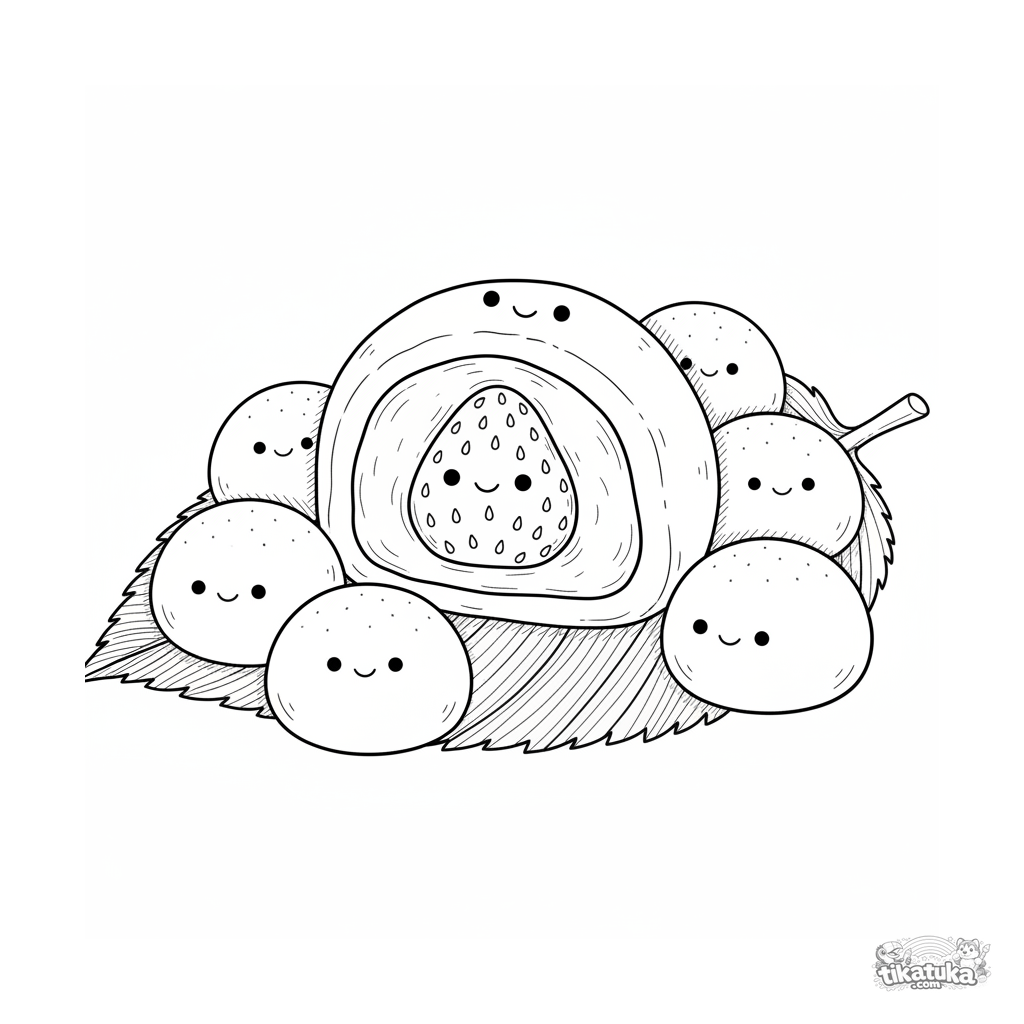 Página para colorir detalhada do corte de um mochi de morango, mostrando o recheio de pasta e fruta. Design educativo e intrincado para 10-12 anos.