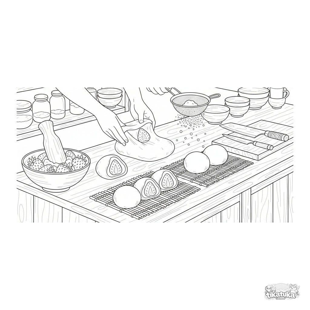 Página para colorir intrincada para crianças mais velhas 10-12: uma cena detalhada da produção de mochi de morango em um balcão de cozinha, mostrando etapas de preparo.