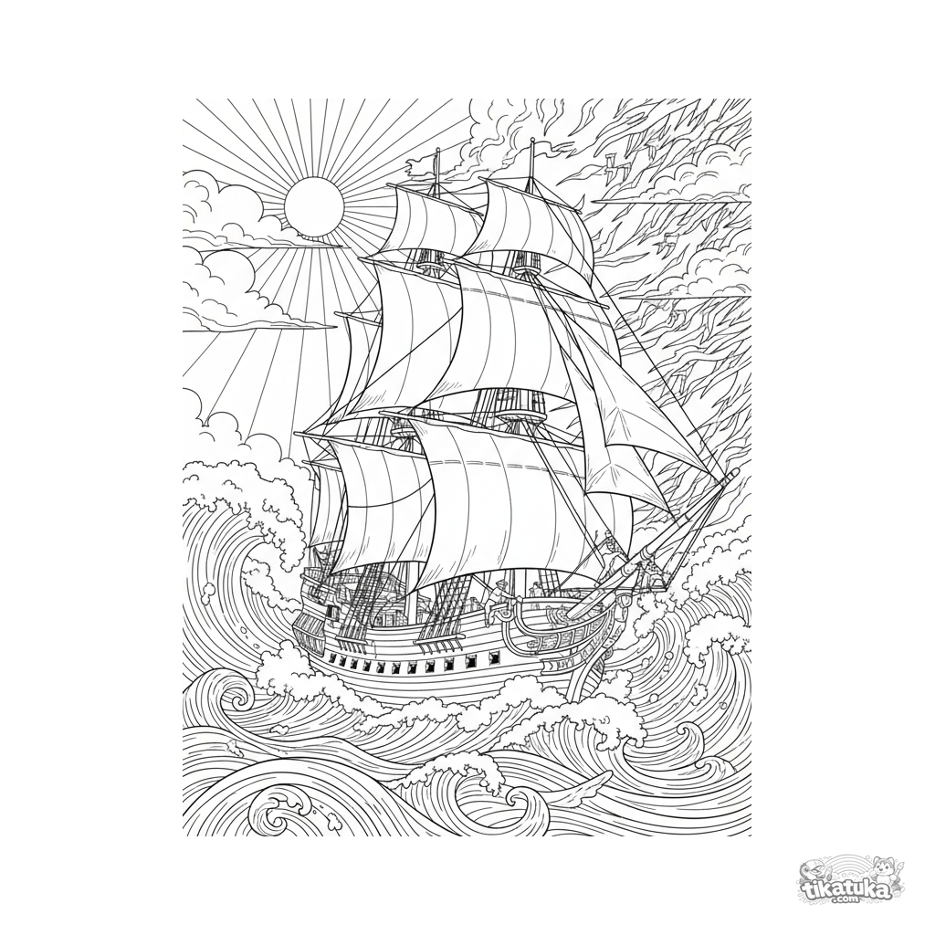 Página para colorir detalhada para crianças mais velhas 10-12: um majestoso navio a vela com velas cheias enfrenta um mar tempestuoso ao pôr do sol.